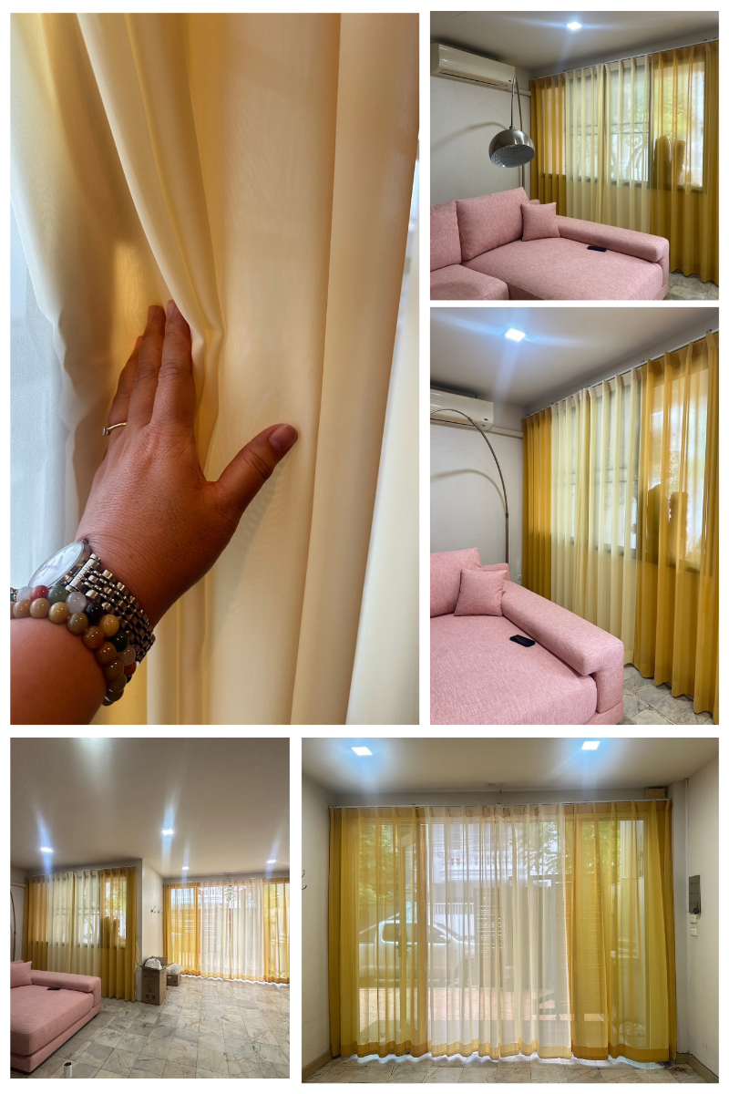 เน้นเป็นผ้าม่านโปร่ง สีขาว ช่วยให้บรรยากาศดูอบอุ่น และ กรองแสงให้ห้องไม่ร้อนเกินไป โดยเลือกผ้าที่มีเนื้อสัมผัสค่อนข้างหนา เพื่อให้ได้ประโยชน์ทั้งกรองแสงและ พรางสายตา
