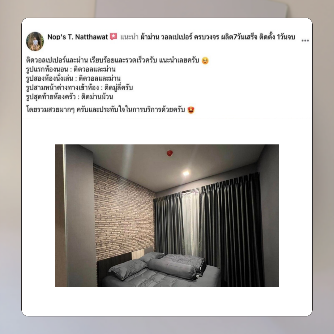 เราค่อย ๆ เริ่มทำงานจากคอนโดห้องเล็ก ผ้าม่าน 1 ชุด สะสมเก็บประสบการณ์ พร้อมไปศึกษาหาข้อมูลเพิ่มเติมจากผ้าม่าน 1 ชุด จนปัจจุบันด้วยประสบการณ์กว่า 10 ปี ไม่ว่าจะเป็นงานเล็ก งานใหญ่ โรงงาน สำนักงานต่างๆ ทีมของเราก็ได้มีโอกาสไปทำมาทั้งหมด ไกลที่สุดที่เราเคยไปคือประเทศจีน ติดผ้าม่านหลุยส์ชุดใหญ่ และงานคอนโดมหานคร กับผ้าม่านมอเตอร์กว่า 50 ตัว นั่นได้พิสูจน์ถึงความชำนาญของช่างและความไว้ใจจากลูกค้าที่ให้เราได้ดูแล เราจึงสามารถการันตีงานของเราได้ทั้งหมด ไม่ว่าจะเป็นงานเล็ก งานใหญ่ ผ้าม่านบ้านทุกแบบ เพื่อสร้างความพึงพอใจให้ลูกค้าของเรา